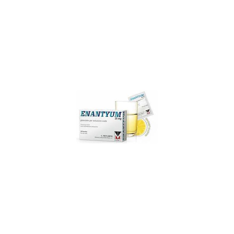 Posologia Adulti In base alla natura e all’intensità del dolore, la dose raccomandata è in genere di 12,5 mg ogni 4–6 ore oppure 25 mg ogni 8 ore. La dose giornaliera totale non deve superare i 75 mg. Gli effetti indesiderati possono essere ridotti al minimo usando la dose minima efficace per il tempo strettamente necessario ad eliminare i sintomi (vedere paragrafo 4.4). ENANTYUM è indicato solo per i trattamenti di breve durata e la somministrazione va limitata al solo periodo sintomatico. Popolazioni speciali Anziani Nei pazienti anziani si raccomanda di iniziare la terapia con la dose terapeutica più bassa (50 mg la dose giornaliera totale). Il dosaggio può essere aumentato in modo da raggiungere quello raccomandato per l’adulto solo dopo che sarà stata accertata una buona tollerabilità. A causa del profilo di rischio (vedere paragrafo 4.4), gli anziani devono essere controllati con particolare attenzione. Disfunzione epatica I pazienti con disfunzione epatica da lieve a moderata devono iniziare la terapia a dosi ridotte (50 mg di dose giornaliera totale) sotto stretto controllo medico. ENANTYUM non deve essere usato in pazienti con disfunzione epatica grave. Disfunzione renale Nei pazienti con insufficienza renale lieve (clearance della creatinina 60 – 89 ml/min) il dosaggio iniziale deve essere ridotto a 50 mg di dose giornaliera totale (vedere paragrafo 4.4). ENANTYUM non deve essere usato in pazienti con insufficienza renale da moderata a severa (clearance della creatinina < 59 ml/min) (vedere paragrafo 4.3). Popolazione pediatrica ENANTYUM granulato per soluzione orale non è stato studiato in bambini e adolescenti. Pertanto, non essendo disponibili dati di sicurezza ed efficacia, il prodotto non deve essere usato nei bambini e adolescenti. Modo di somministrazione Sciogliere l’intero contenuto di ogni bustina in un bicchier d’acqua: mescolare bene per sciogliere completamente. La soluzione così ottenuta deve essere ingerita immediatamente dopo la ricostituzione. La concomitante somministrazione di cibo ritarda la velocità di assorbimento del farmaco (vedere "Proprietà farmacocinetiche"), per cui, in caso di dolore acuto, si raccomanda di somministrare il farmaco almeno 15 minuti prima dei pasti. Controindicazioni: ENANTYUM granulato per soluzione orale non deve essere somministrato nei seguenti casi: – pazienti con ipersensibilità accertata verso il principio attivo, o verso qualsiasi altro FANS, o uno qualsiasi degli eccipienti elencati al paragrafo 6.1; – pazienti che hanno sviluppato asma, broncospasmo, rinite acuta, polipi nasali, orticaria o angioedema dopo esposizione a sostanze dal meccanismo di azione simile (per es. acido acetilsalicilico, o altri FANS) – pazienti con reazioni fotoallergiche o fototossiche note durante il trattamento con ketoprofene o –fibrati; – pazienti con anamnesi di sanguinamento o perforazione gastrointestinale correlata a una precedente terapia con FANS; – pazienti con ulcera peptica attiva/emorragia gastrointestinale in atto o un qualsiasi precedente anamnestico di sanguinamento, ulcerazione o perforazione gastrointestinale; – pazienti con dispepsia cronica; – pazienti che hanno altri sanguinamenti in atto o disturbi della coagulazione; – pazienti con morbo di Crohn o colite ulcerosa; – pazienti con insufficienza cardiaca grave; – pazienti con insufficienza renale da moderata a severa (clearance della creatinina <59 ml/min); – pazienti con insufficienza epatica grave (punteggio di Child–Pugh 10–15); – pazienti con diatesi emorragica e altri disturbi della coagulazione; – pazienti con disidratazione grave (causata da vomito, diarrea o insufficiente assunzione di liquidi); – durante il terzo trimestre di gravidanza e l’allattamento (vedere paragrafo 4.6). Effetti indesiderati: Nella tabella sottostante, raggruppati per apparato ed elencati in ordine di frequenza, sono riportati gli eventi avversi, probabilmente correlati con dexketoprofene trometamolo, verificatisi nel corso di studi clinici e dopo la commercializzazione di ENANTYUM granuli. I livelli plasmatici Cmax di dexketoprofene nella formulazione in granuli sono superiori a quelli riportati per la formulazione in compresse, pertanto non è possibile escludere un potenziale aumento del rischio di eventi avversi (gastrointestinali).