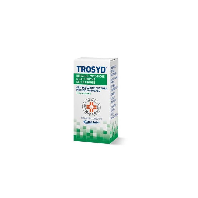 TROSYD 1% Crema - 1% Polvere cutanea - 1% Emulsione cutanea Dermatomicosi causate da dermatofiti, lieviti ed altri miceti sensibili al tioconazolo. Infezioni cutanee provocate da batteri Gram-positivi sensibili al farmaco. Per la concomitante attività antimicotica e antibatterica, è particolarmente indicato nelle infezioni cutanee miste. TROSYD 28% Soluzione cutanea per uso ungueale Onicomicosi causate da dermatofiti e lieviti. Per la concomitante attività antibatterica, è particolarmente indicata nelle infezioni delle unghie miste. TROSYD 1% Soluzione cutanea Trattamento antimicotico topico delle infezioni cutanee causate da miceti (dermatofiti e lieviti), anche se associate a sovrainfezioni da batteri Gram-positivi sensibili al medicinale, come coadiuvante alla terapia con altre preparazioni topiche specifiche. La soluzione cutanea permette una maggiore facilità di applicazione nelle dermatomicosi più estese ed esplica una detersione medicata della cute glabra o pelosa. Inoltre, consentendo il trattamento di un'ampia superficie cutanea, rende possibile l'eliminazione dell'agente patogeno non solo dove sono rilevabili variazioni morfologiche cutanee ma anche dove la cute è apparentemente sana.