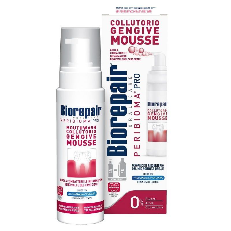 Mousse Biorepair PERIBIOMA PRO, dalla morbida e soffice consistenza, avvolge delicatamente le gengive donando sollievo e protezione duratura. La formula è a base di microRepair BIOMA, microcristalli ripara-smalto* arricchiti con specifici Probiotici selezionati che aiutano a riequilibrare il normale microbiota orale per proteggere dalle principali cause delle infiammazioni del cavo orale. Biorepair PERIBIOMA Mousse è potenziata con Mastica di Chios per un'azione antibatterica e antimicrobica. Le vitamine A, C, E e l’acido ialuronico arricchiscono la mousse con le loro proprietà antiossidanti e detox sui tessuti.