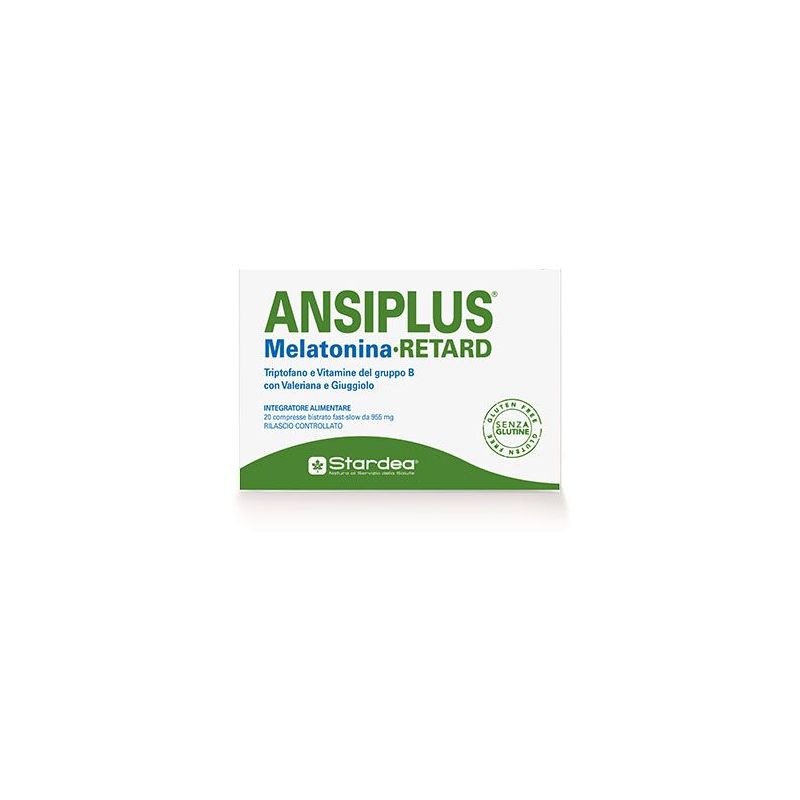 ANSIPLUS Melatonina RETARD Descrizione Integratore alimentare a base di melatonina, triptofano e vitamine del gruppo B, con valeriana e giuggiolo. Compresse bistrato fast-slow. Rilascio controllato. La melatonina contribuisce alla riduzione del tempo richiesto per prendere sonno ed è utile anche per alleviare gli effetti del jet-leg. La valeriana e il giuggiolo favoriscono il rilassamento e il sonno. Le vitamine B3 e B6 sostengono la normale funzione psicologica e contribuiscono alla riduzione della stanchezza e dell'affaticamento. Ingredienti Agente di carica: cellulosa microcristallina; L-triptofano; giuggiolo estratto secco tit. 2% in jujubosidi (ziziphus Jujuba miller semi); valeriana estratto secco tit. 0,42% in acidi sesquiterpenici (valeriana officinalis l. Radici). Agente di carica: fosfato di calcio. Stabilizzante e agente di rivestimento: idrossipropilmetilcellulosa, nicotinammide ricoperta tit. 33%. Agente antiagglomerante: polivinilpolipirrolidone; aroma. Agenti antiagglomeranti: sali di magnesio degli acidi grassi, polivinilpirrolidone, biossido di silicio. Agente di rivestimento: cellulosa microcristallina; piridossina cloridrato ricoperta tit. 33%. Agente di rivestimento: acidi grassi; melatonina; aroma; coloranti: ferro ossido giallo, ferro ossido nero, blu brillante FCF, carminio d'indaco. Modalità d'uso 1 compressa da assumere alla sera prima di coricarsi. Avvertenze Non superare la dose giornaliera raccomandata. Tenere fuori dalla portata dei bambini al di sotto dei 3 anni di età. Gli integratori non vanno intesi come sostituti di una dieta variata ed equilibrata e di uno stile di vita sano. Conservazione Conservare in luogo fresco e asciutto. Formato Scatola da 20 compresse (955 mg cad.)