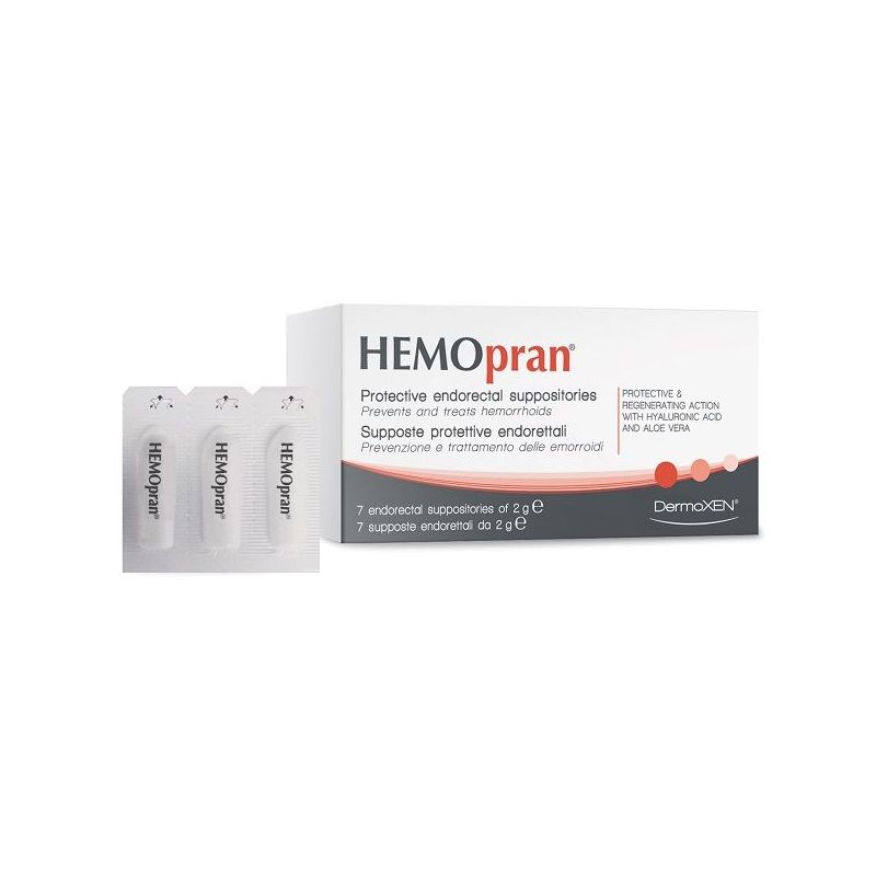 DermoXEN HEMOpran Descrizione Supposte protettive endorettali indicate per la prevenzione ed il trattamento delle emorroidi interne ed esterne. Grazie alla presenza di acido ialuronico e aloe vera, creano un film protettivo ed emolliente, aiutando a ripristinare lo stato di idratazione e lubrificazione. Gli estratti di rusco, amamelide e ippocastano presenti in formula esercitano un’azione lenitiva ed antiossidante. Modalità d'uso 1 supposta endorettale al giorno per 7 giorni consecutivi o secondo consiglio del medico. È consigliabile di non defecare (se possibile) almeno 1 ora dopo la somministrazione; in caso contrario, la somministrazione dovrà essere ripetuta. Componenti Ogni supposta endorettale da 2 g contiene: estratto lipofilo di radice di Ruscus aculeatus, estratto lipofilo di foglie di Hamamelis virginiana, estratto lipofilo di semi di Aesculus hippocastanum, estratto di foglie di Aloe barbadensis, vitamina E, acido ialuronico (sale sodico), trigliceridi semi-sintetici. Avvertenze Tenere lontano dalla portata dei bambini. Non ingerire. Non utilizzare in caso di ipersensibilità o allergie ad uno o più degli ingredienti. Non utilizzare dopo la data di scadenza indicata sull’astuccio. Non utilizzare se la confezione è aperta o danneggiata. Evitare il contatto con gli occhi; in caso di contatto, sciacquare con abbondante acqua. Non superare la dose raccomandata, salvo diversa indicazione del medico. Conservazione Conservare in un luogo fresco ed asciutto, ad una temperatura inferiore a 25 °C. Validità confezionamento integro: 36 mesi. Formato 7 supposte da 2 g. Cod. EKHP00512