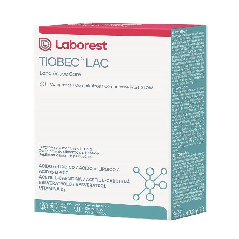 Descrizione Integratore alimentare a base di acido alfa-lipoico, acetil L-carnitina, resveratrolo e vitamina D3, utile in presenza di carenze alimentari o aumentati fabbisogni. L’esclusiva tecnologia di produzione di Tiobec LAC garantisce il rilascio controllato nel tempo dell’acido alfa-lipoico.