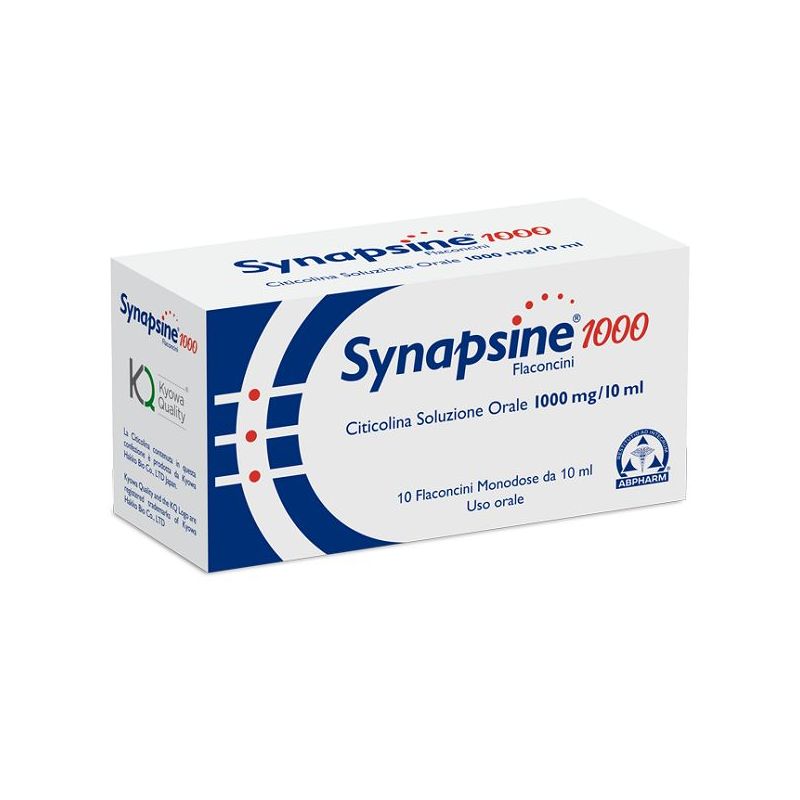 Synapsine 1.000 Descrizione Può essere utilizzato nel trattamento di: Sistema nervoso centrale: sindromi psicorganiche cerebrali degenerativo-involutive o secondarie a insufficienza cerebrovascolare, disturbi cognitivi dell'anziano caratterizzati da deficit di memoria, confusione, disorientamento, e dalla riduzione delle capacità attentive, cerebrovasculopatie acute e croniche, trauma cranico, sequele post-ischemiche cerebrali, morbo di Parkinson, morbo di Alzheimer. Funzionalità visive: glaucoma, ambliopia, scotomi. Funzionalità acustiche: vertigine, tinnito, acufene. La citicolina, nota anche come Citidin5-difosfocolina o CDP-Colina, è una molecola presente nell'organismo. Viene fisiologicamente utilizzata quale precursone nella sintesi endogena dei fosfolipidi di membrana delle cellule nervose. Rappresenta il substrato biologico necessario alla sintesi dell'acetilcolina e di altri neurotrasmettitori, fondamentali per la propagazione degli impulsi nervosi. La citicolina svolge il suo ruolo biochimico-metabolico: Stimolando la biosintesi dei fosfolipidi cerebrali (fosfatidilcolina, fosfatdilserina, fosfatidiletanolamina). Incrementando la sintesi dell'acetilcolina e di altri neurotrasmettitori per aumentata biodisponibilià di colina a livello neuronale. Migliorando l'emodinamica microcircolatoria cerebrale e incrementando il flusso plasmatico cerebrale. Ingredienti Citicolina. Modalità d'uso Si consiglia di assumere 1 flaconcino al giorno, salvo diversa prescrizione medica. Conservazione Conservare a temperature inferiori a 22 °C. Validità a confezionamento integro: 36 mesi. Formato 10 flaconcini monodose. Peso netto: 100 ml.