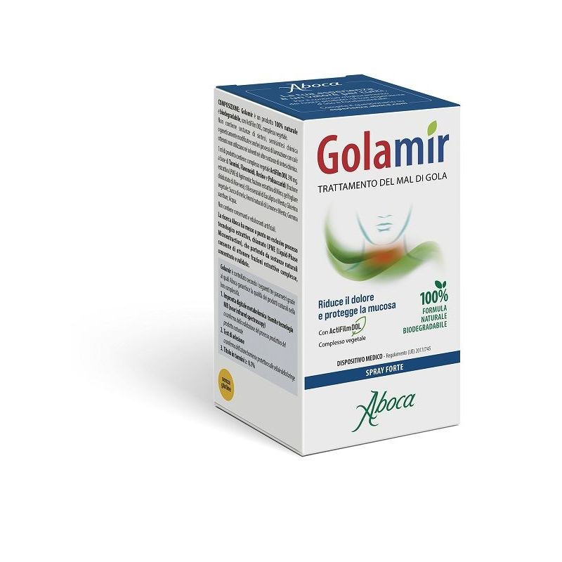 Golamir è un dispositivo medico indicato nei casi di mal di gola per il trattamento degli stati irritativi e infiammatori del cavo orofaringeo, che possono essere causati da virus, batteri, allergeni o dal contatto con agenti esterni irritanti (fumo, smog, polvere). Il prodotto è adatto anche negli stati di raffreddamento dove le secrezioni nasali, scendendo nella gola, possono essere causa di irritazione.